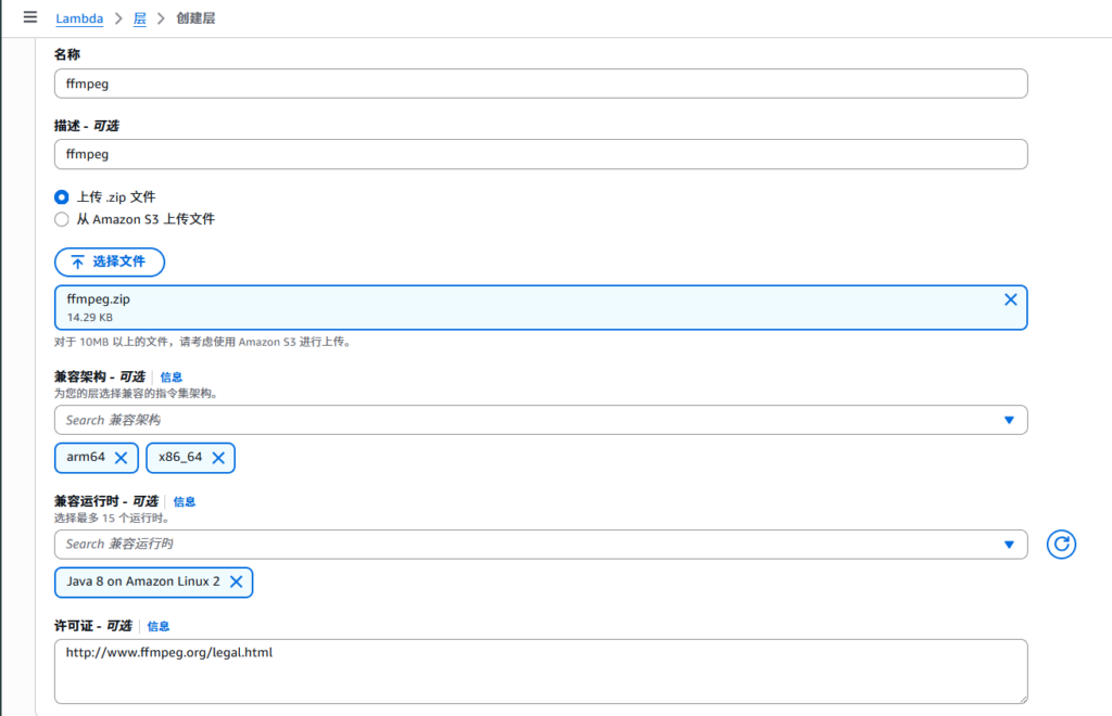 - 将生成的ffmpeg.zip包上传到 S3 或者手动上传文件,然后在 Lambda 控制台创建一个新的层,指向该包,就像我们下图中所做的那样。本次演示只需“java8”运行时