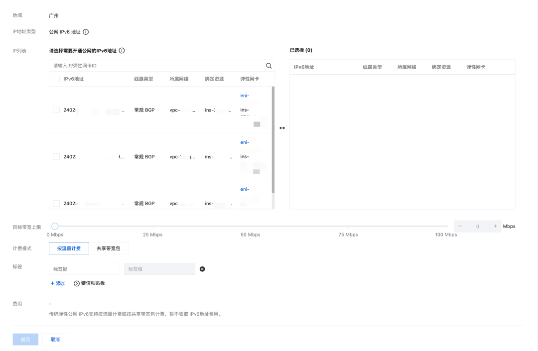 - 选择传统弹性公网 IPv6 > 开通 IPv6 公网带宽。