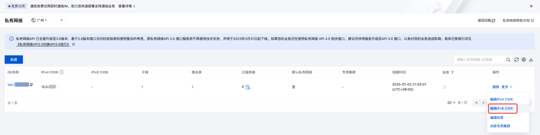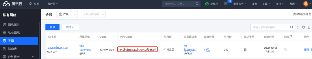 4)登录 私有网络控制台,查看云服务器所在子网的 IPv6 CIDR 信息。