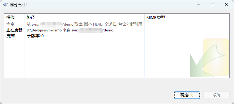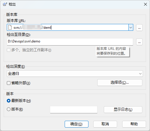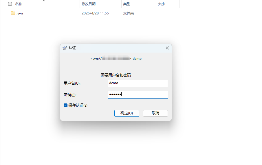 版本库URL:svn://服务器IP/项目名称, 然后点击确定