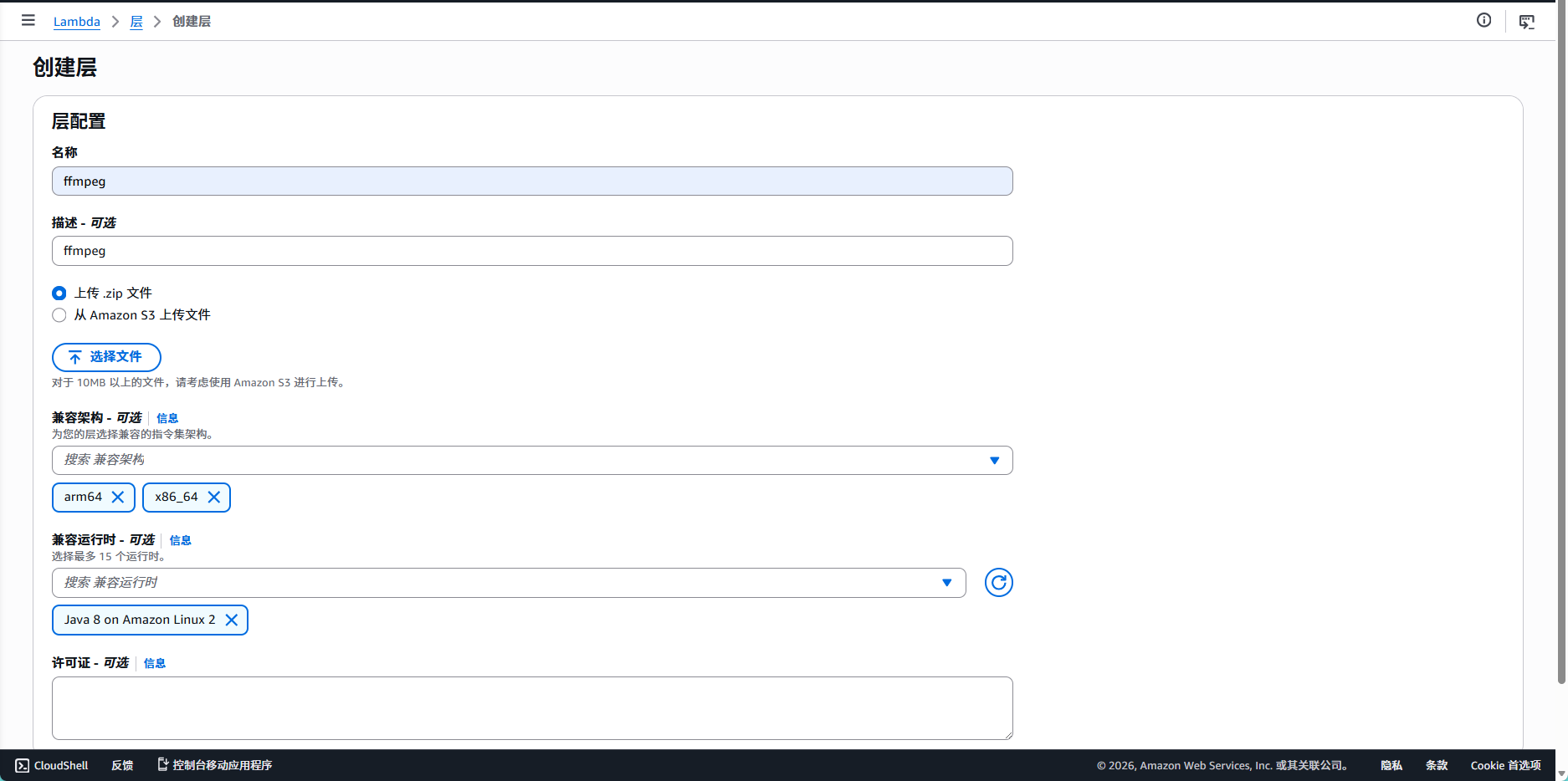 将生成的ffmpeg.zip包上传到 S3 或者手动上传文件,然后在 Lambda 控制台创建一个新的层,指向该包,就像我们下图中所做的那样。本次演示只需“java8”运行时