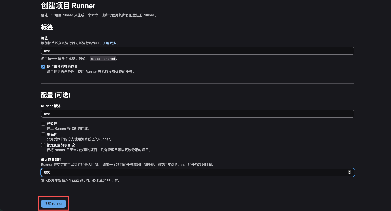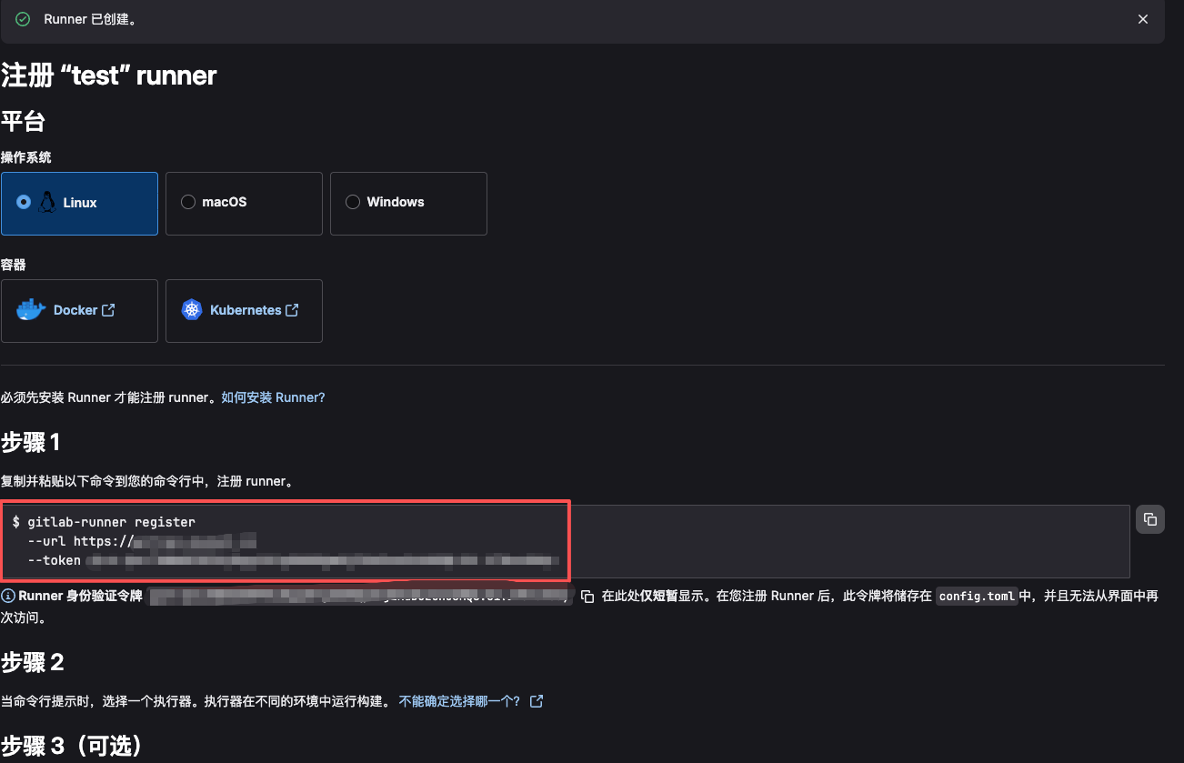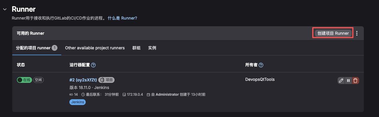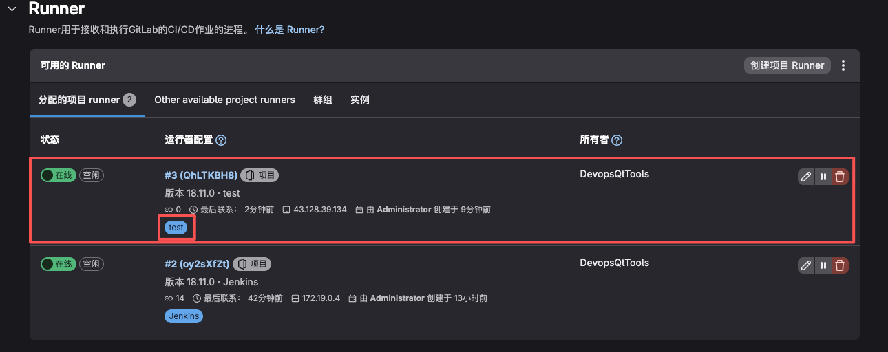 注册成功后,Gitlab Runner 会新增一个运行器(test)