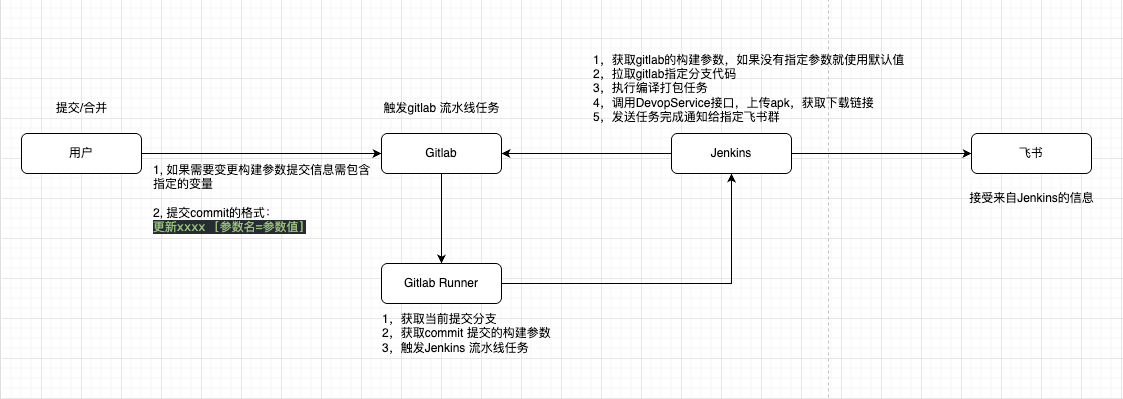 方案概述 实现GitLab、Jenkins、DevOps Service与飞书机器人的无缝集成,以支持多分支、多构建参数的持续集成与持续部署(CI/CD)流程。自动化构建和部署过程,并通过飞书机器人及时获取构建与部署状态。